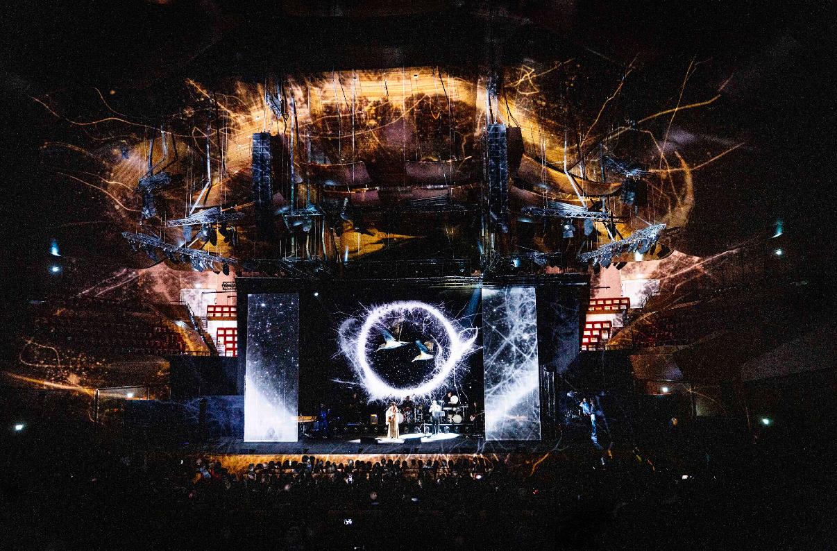 Anche i duetti – con Mahmood, Jovanotti e il tenore Leonardo Sgroi – presenti nel disco vengono trattati come presenze indirette, senza trasformarli in “momenti”. L’unico colpo di realtà, in mezzo a un impianto che guarda molto al tempo lungo e alla stratificazione culturale, arriva quando sugli schermi compaiono immagini legate alle manifestazioni per la Palestina: è un inserto breve, ma sufficiente a spostare per un attimo il clima della sala, ricordando che quel discorso sul passato non resta isolato e che la dimensione politica entra nello spettacolo senza essere dichiarata apertamente.