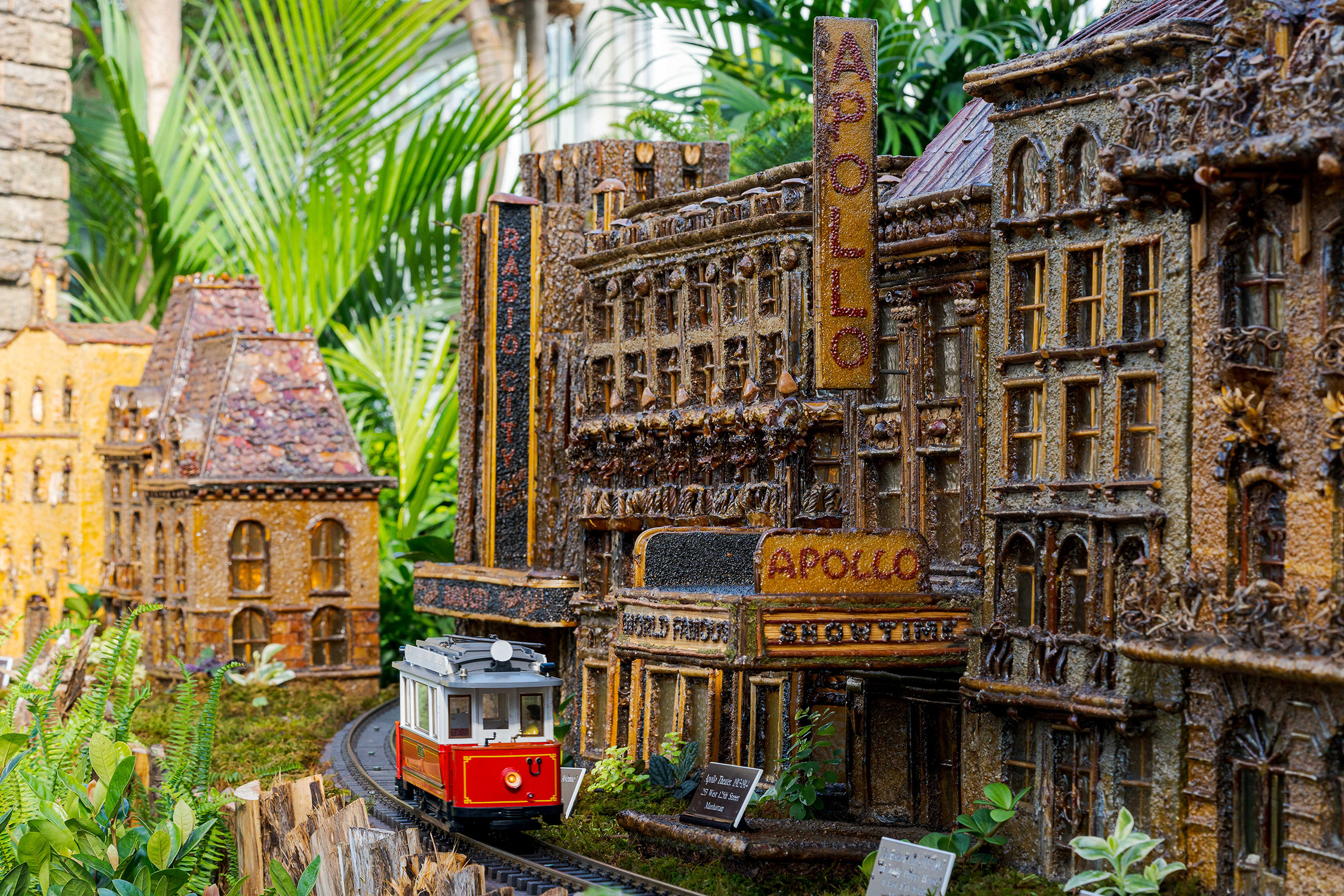Lo spettacolo dei treni delle feste è una suggestiva cartolina natalizia che ricrea paesaggi da favola o da film attraverso gli edifici più iconici della Grande Mela. I materiali da costruzione provengono dal suolo delle foreste, le pareti dell’Empire State Building, ad esempio, sono fatte di ippocastani, la cima del Chrysler Building è fatta di foglie di palma e ci sono anche repliche di strutture che non esistono più, come il primo Yankee Stadium oppure la vecchia Penn Station. Ci sono inoltre la Statua della Libertà, One World Trade Center, City Hall, sede del Comune di New York, la stazione di Grand Central.