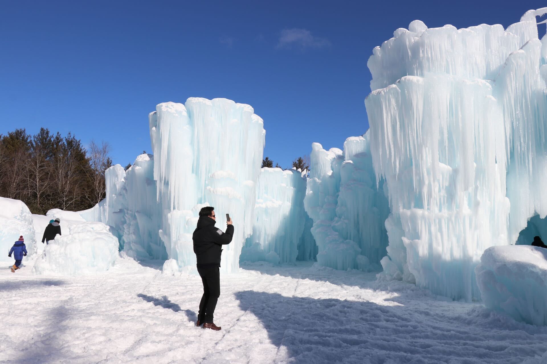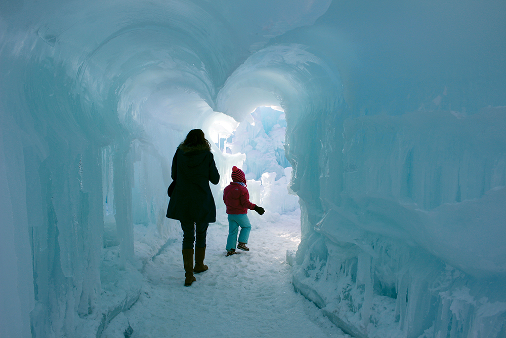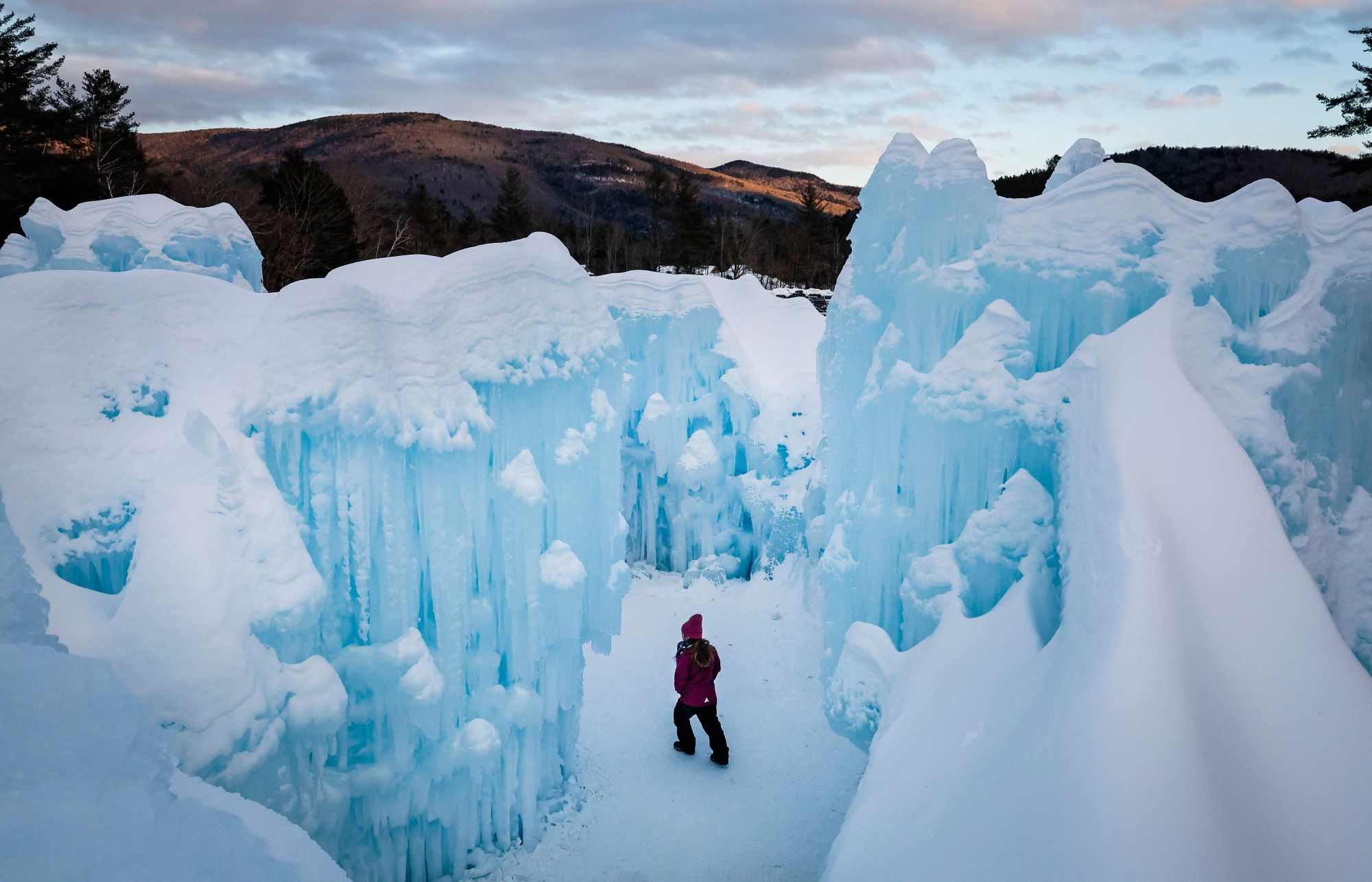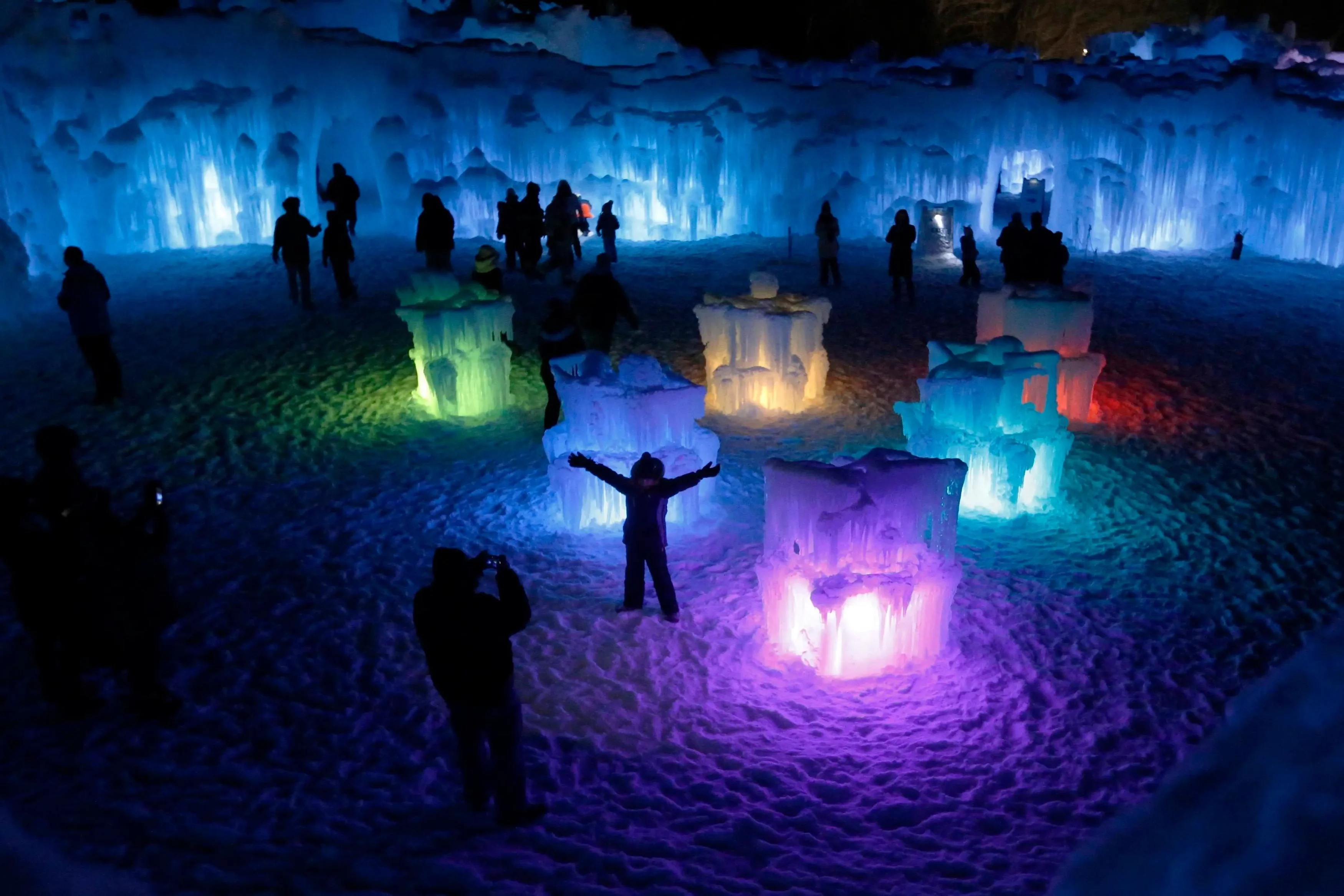 Per la stagione 2025–2026, il sito di North Woodstock celebra il quindicesimo anno di attività. L’area occupata è di circa quattromila metri quadrati e comprende archi monumentali, ponti di ghiaccio, cavità interne alte diversi metri, fontane congelate e scivoli su più livelli ricavati direttamente nella struttura. Di giorno il ghiaccio mantiene una colorazione naturale, ma è la sera che la vera magia prende vita grazie all’illuminazione tramite luci LED integrate, che cambiano la tonalità del ghiaccio e rendono visibili anche le parti interne delle pareti.