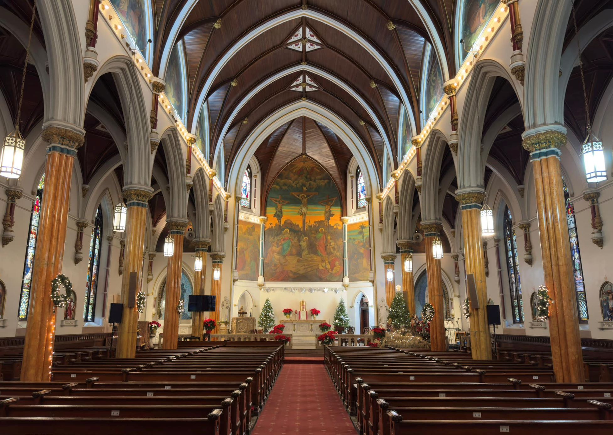 L’edificio attuale è quello ricostruito dopo un devastante incendio nel 1896. Realizzato in stile neogotico con il caratteristico manhattan schist, il campanile porta quattro orologi incorniciati in rame. Le travi di legno che sorreggono il soffitto ricordano la chiglia di una nave, simbolo del viaggio degli immigrati e della loro voglia di costruirsi un futuro.