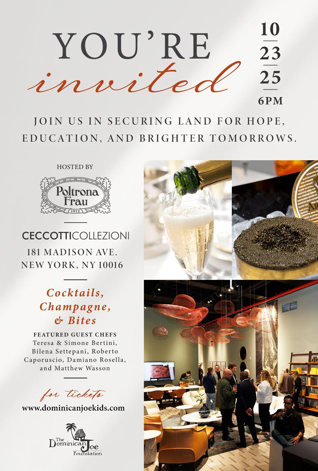 Il 23 ottobre, alle 18, lo showroom Ceccotti Collezioni di Madison Avenue ospiterà un evento di beneficenza dedicato alla Dominican Joe Foundation, organizzazione impegnata nel sostegno a programmi di istruzione e sviluppo per bambini e comunità svantaggiate. L’iniziativa punta a raccogliere fondi per garantire “terra, istruzione e un futuro migliore”, come recita il motto scelto per la serata.