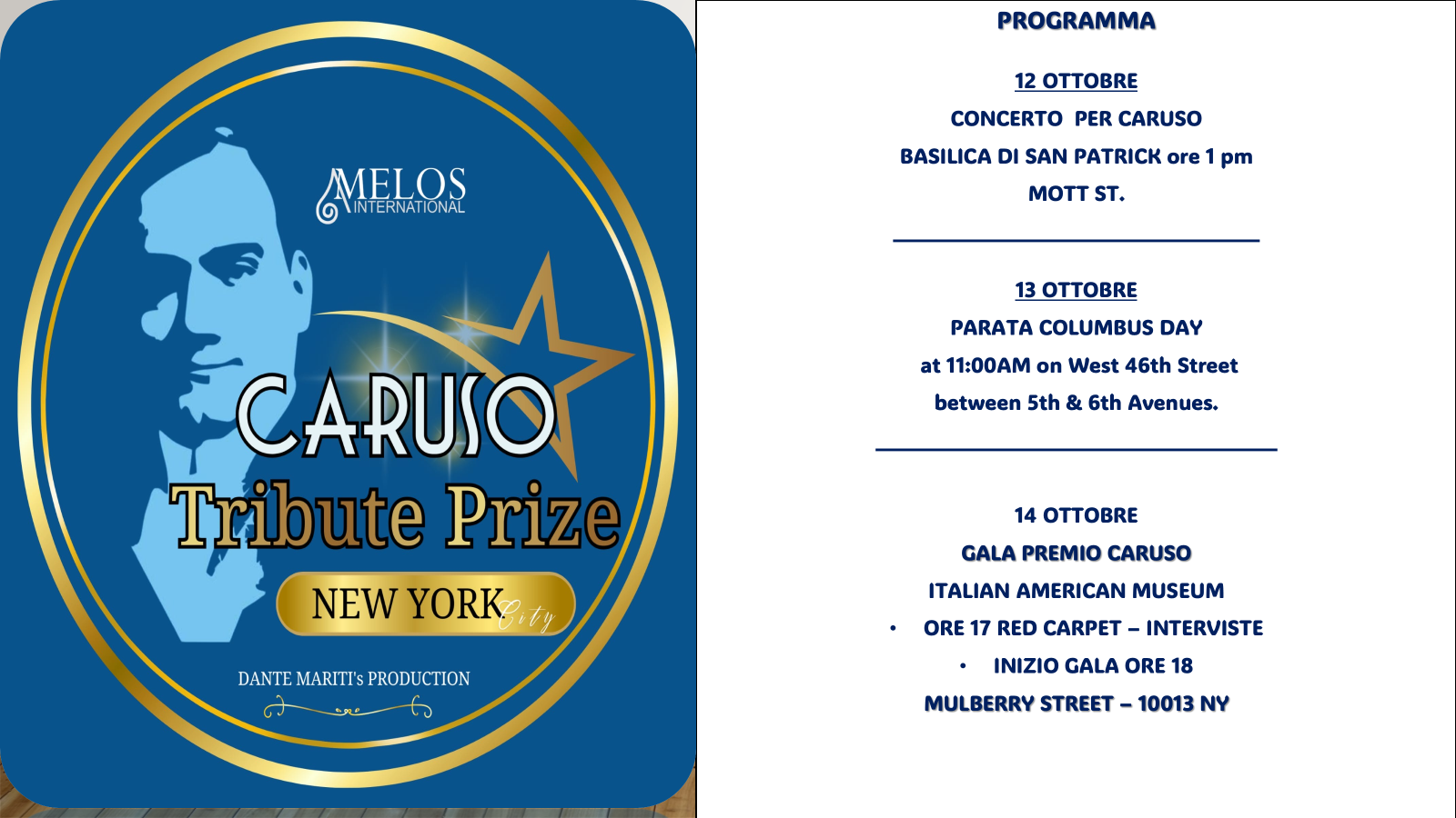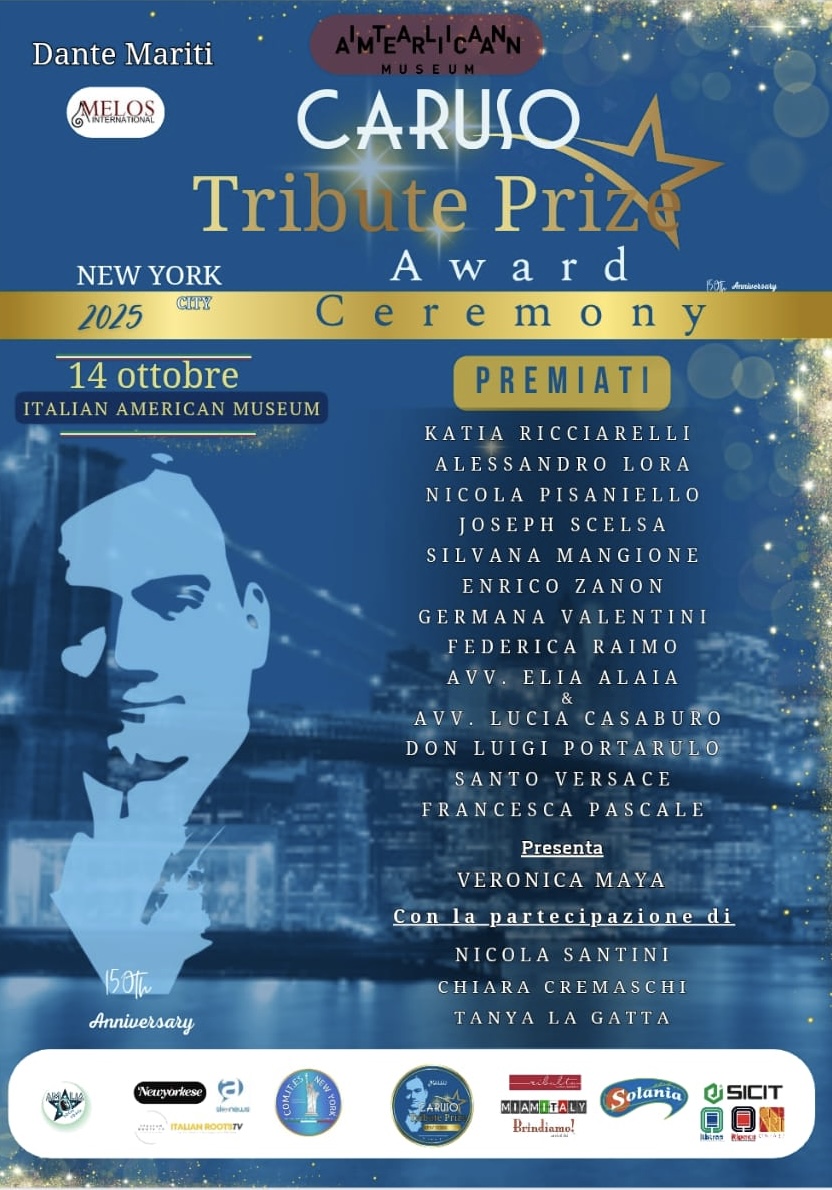 A New York si prepara la quinta edizione del Caruso Tribute Prize, il riconoscimento ideato dal produttore televisivo Dante Mariti e organizzato da Melos International per celebrare la figura del tenore napoletano Enrico Caruso. L’evento, in programma dal 12 al 14 ottobre in concomitanza con il Columbus Day, prevede concerti, momenti celebrativi e una cerimonia di premiazione presso l’Italian American Museum, con il patrocinio del Consolato Generale d’Italia e dei Comites di New York.
