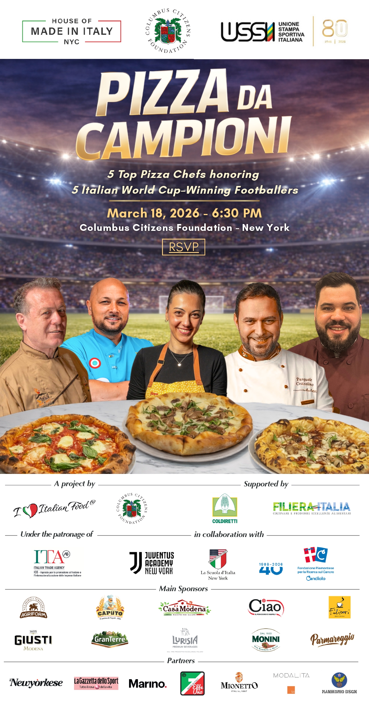 Durante Pizza da Campioni, cinque pizzaioli tra i più rinomati a New York realizzeranno altrettante pizze dedicate a cinque protagonisti delle vittorie dell’Italia ai Mondiali del 1982 in Spagna e del 2006 in Germania, due momenti che rappresentano ancora oggi i principali riferimenti della storia sportiva recente della Nazionale. Quelle due competizioni hanno contribuito a consolidare l’immaginario internazionale dell’Italia calcistica, anche grazie alle figure di Paolo Rossi, Fabio Cannavaro e Andrea Pirlo, diventate veri e propri simboli dell’italianità anche fuori dall’ambito sportivo.