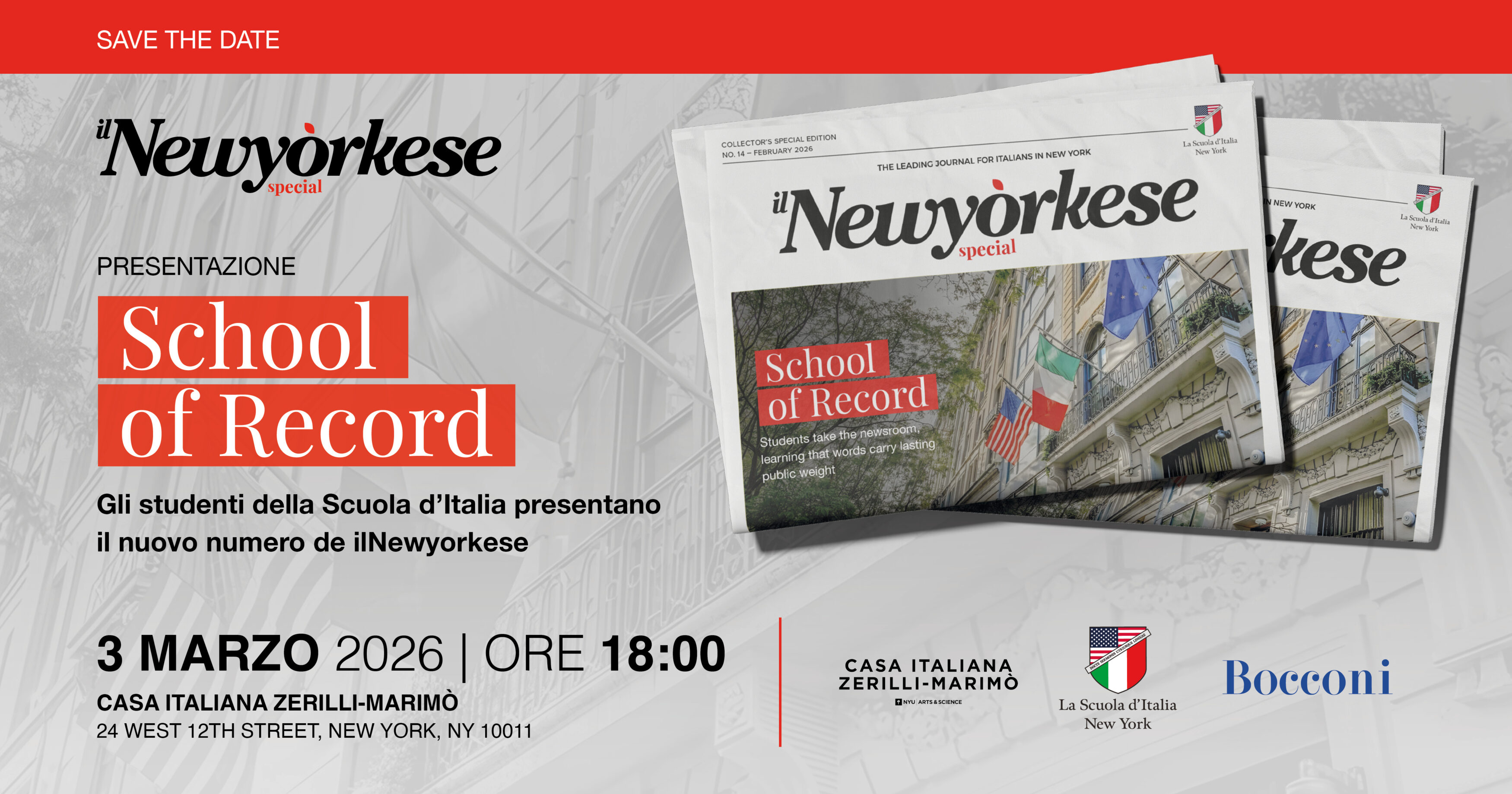All’evento di presentazione alla Casa Italiana Zerilli-Marimò, in programma martedì 3 marzo a partire dalle 6:00 PM, interverranno, tra gli altri, Silvana Mangione, Vice Segretario Generale del CGIE, Giuseppe Pastorelli, Console Generale d’Italia a New York, Davide Ippolito, fondatore de ilNewyorkese, Stefano Albertini della NYU, Anthony Martire, Head of School ad interim, e Cristiana Grassi, coordinatrice del Middle Years Program della scuola. È prevista anche la partecipazione di Cristiana Mancini, caposervizio Esteri di SKY, di Bilena Settepani, alla guida della Settepani Bakery, realtà imprenditoriale radicata nella comunità italo-americana di Brooklyn, e di Mattia Scarpa, alumnus della scuola e oggi studente dell’Università Bocconi.