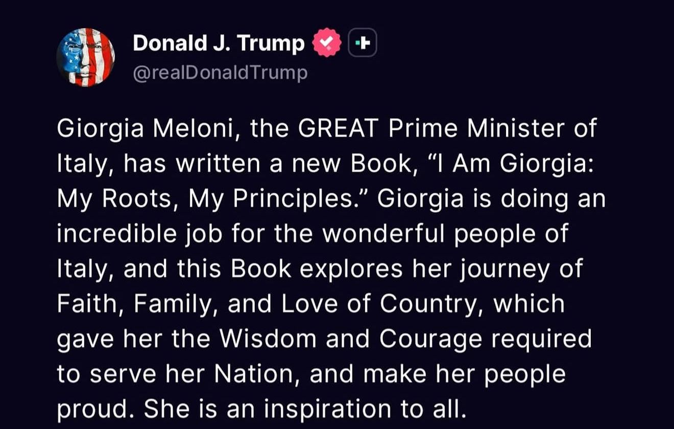 Donald Trump ha pubblicato un messaggio sui social in cui elogia la presidente del Consiglio italiana Giorgia Meloni e promuove il suo libro I Am Giorgia: My Roots, My Principles. Nel post, il presidente degli Stati Uniti definisce Meloni «una grande Primo Ministro» e sostiene che stia facendo «un lavoro incredibile per il meraviglioso popolo d’Italia».