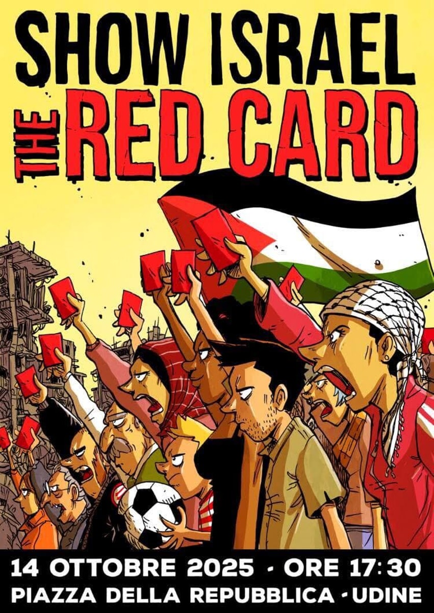 Alle 17:30 partirà da piazza della Repubblica il corteo pro Palestina, che attraverserà il centro di Udine fino a piazza Primo Maggio. Il disegno che promuove la manifestazione arriva dal celebre artista romano Zerocalcare e si ispira allo slogan dell’iniziativa nata nel mondo ultras “Show Israel the red card”, che chiede l’esclusione di Israele dalle competizioni Fifa.
