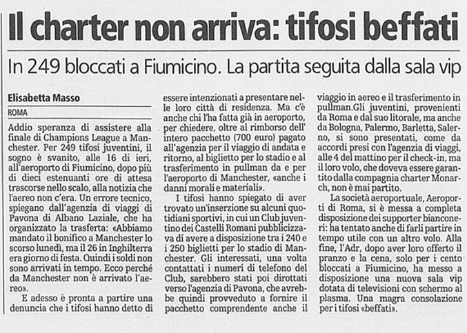 Ricordo che all’epoca, venticinquenne, fui mandato da Radio 24, emittente della quale ero inviato su Roma per la redazione sportiva, all’aeroporto di Fiumicino, dove centinaia di tifosi della Juventus erano rimasti bloccati a causa dell’annullamento del volo che li avrebbe dovuti portare in Inghilterra per vedere la partita. Vidi così quella Finale, con loro, dalla sala vip dell’aeroporto romano, messa a disposizione dei malcapitati dalla società AdR.